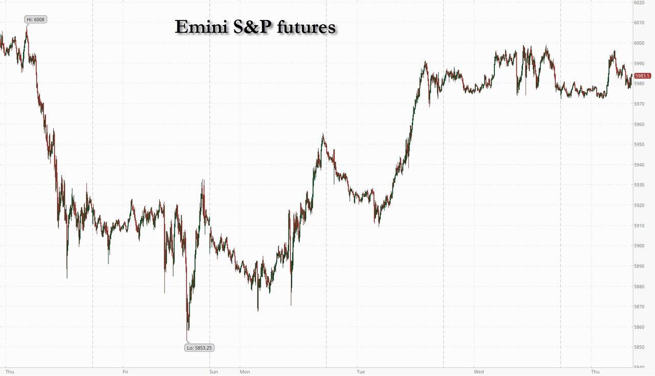 US equity futures are unchanged, as they struggle for direction ahead of Friday’s payrolls report, following a series of data releases that offered mixed signals on the health of the economy. As of 8:00am, S&P futures are flat, having traded on either side of the unchanged line during the overnight session and followed a slurry of weak macro data releases which saw Wednesday's gains erase and recover, with the S&P ultimately ending the day flat. Nasdaq 100 futs are down 0.1% with Mag 7 stocks mostly higher except for TSLA (-1.6%). Stocks and bonds in Europe gained ahead of the ECB's expected 8th consecutive interest rate cut. The yield on 10-year US Treasuries steadied as Wednesday’s bond rally faded. The dollar reversed earlier losses even as gold surged to briefly top $3400. Commodities are mostly mixed with notable outperformance in silver (+3.1%). News flow since yesterday’s close has been largely muted: headlines continue to focus on trade negotiation development, particularly implication on rare earth curbs (BBG and CNBC) and upcoming Trump-Xi call.