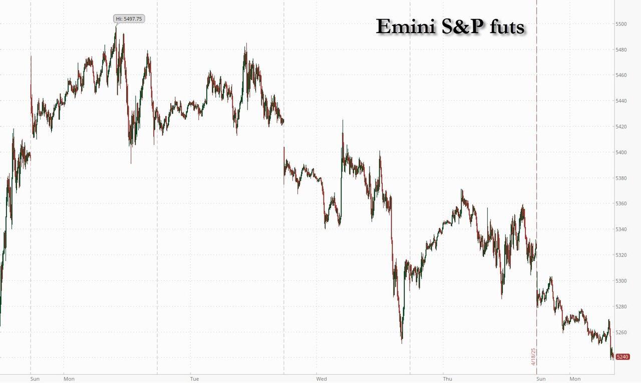With most global markets still closed for Easter holiday, US equity futures start the week sharply lower while the dollar and Treasuries plunge (10s and 30s are 8bp and 10bps higher as the yield curve twists steeper) as traders reacted to the possibility that Trump will try to remove Powell. As of 8:00am ET, S&P futures are down 1.3% and Nasdaq futures slide 1.5% with Mag7 names under pressure with INTC/NFLX among the bright spots in TMT. European stock markets were largely still shut for a public holiday. The dollar is set up to have its worst day in 2 weeks, plunging to a 15 month low, and sending precious metals soaring: gold was above $3400 at last check. Energy is weaker, Ags/base metals are higher. There is also trouble in trade deal land with Japan pushing back on US demands for its trade deal, while China warns trading partners against mistreatment in any deal made with the US. It's a quiet day with just the Leading index on today's calendar (10am); Fed's Goolsbee speaks at 8:30am.