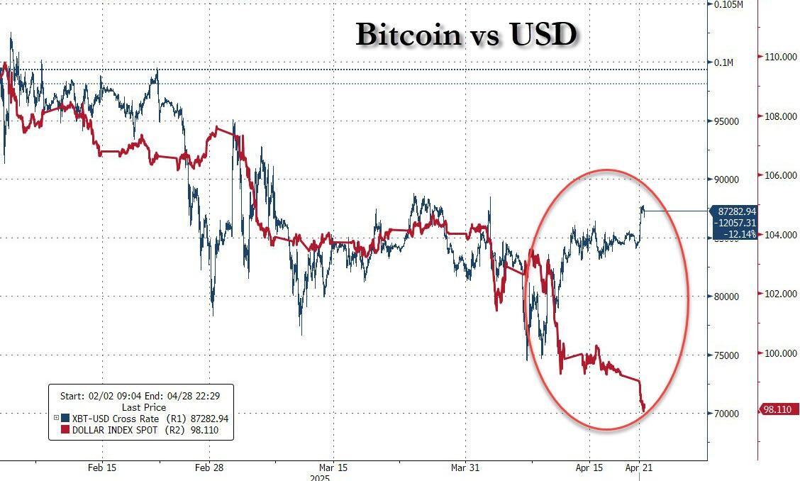 But while gold's surge was to be expected, the most notable move overnight is that bitcoin finally snapped higher, breaking its recent correlation with the dollar (and inverse correlation with the yen due to its carry trade funding), and surged above $87,000, suggesting a sharp move higher in bitcoin may be imminent, especially once other central banks start easing to offset the collapse in the USD.