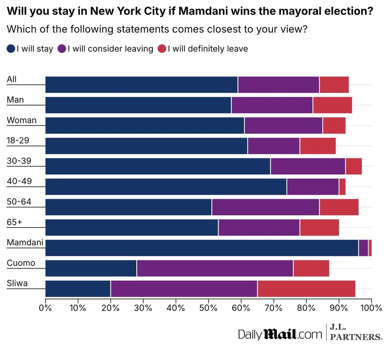 The survey shows Mamdani leading the November 4 race with 45 percent among decided voters. By contrast, only 59 percent of New Yorkers say they would definitely stay if he wins.