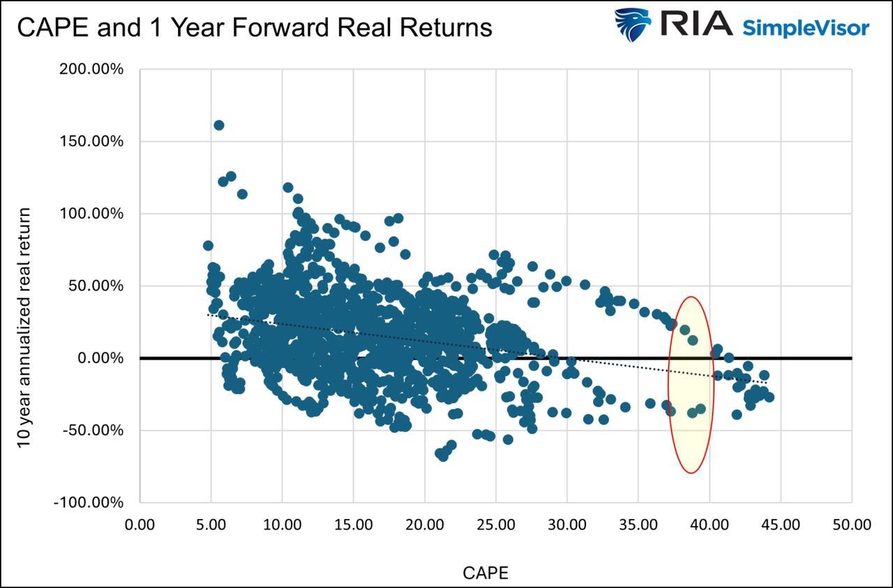 The first graph below shows the extent to which the CAPE10 valuation at 39 is stretched. Based on historical correlations between valuations and returns, we should expect negative real returns over the next 10 years. However, the second graph indicates that returns of +/- 25% are possible in 2026.