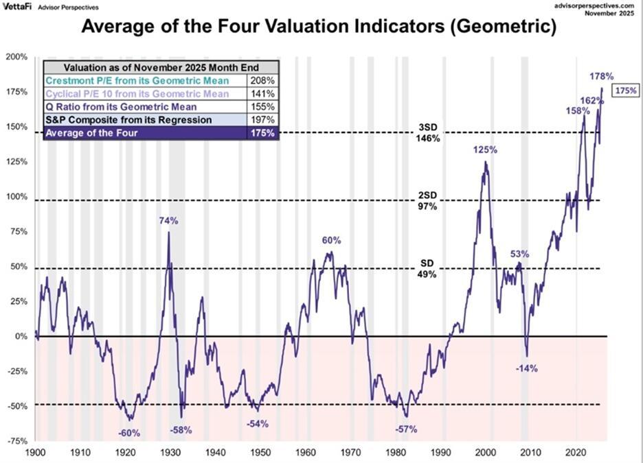 Valuations are stretched! The first graphic below, courtesy of Goldman Sachs, shows that 12-month forward P/E ratios are significantly elevated globally. The second from Crestmont indicates that the average of four widely used valuation techniques is at a record high.