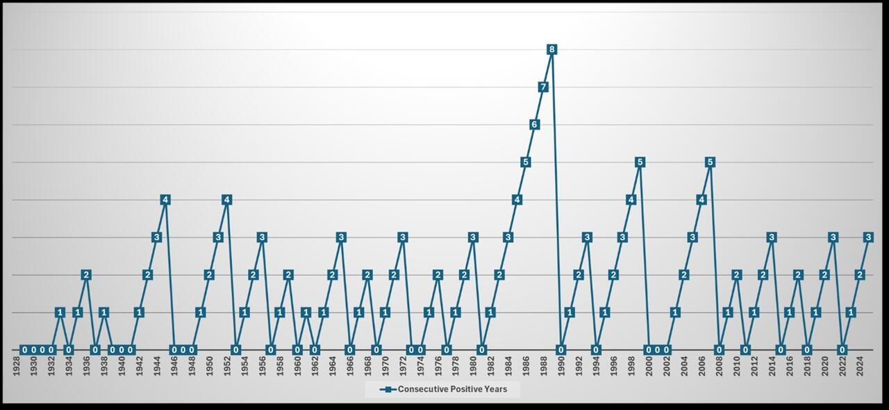 The second graph below is courtesy of one of our clients. His graph helps us assess whether we can expect a fourth consecutive year of positive returns. As shown, eight straight years is the record, with two four- and five-year winning streaks.