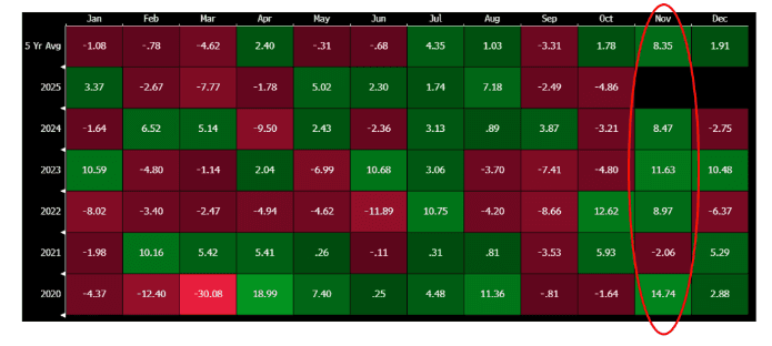 However, he said, "It is worth noting that November is the best month for Consumer Discretionary of the year. The last 5 years, the group is +8.4% during November, on average, with an 80% hit rate. It is the largest outperformance month vs the market, on average, as well."