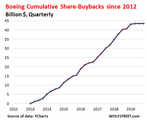 Boeing is also on the bailout docket. Today it called for “at least” a $60-billion bailout of the aerospace industry, where it is the biggest player. It alone wasted, blew, and incinerated $43 billion in cash since 2012 to manipulate up its own shares until its liquidity crisis forced it to stop the practice last year, and its shares have since collapsed (buyback data via YCHARTS):