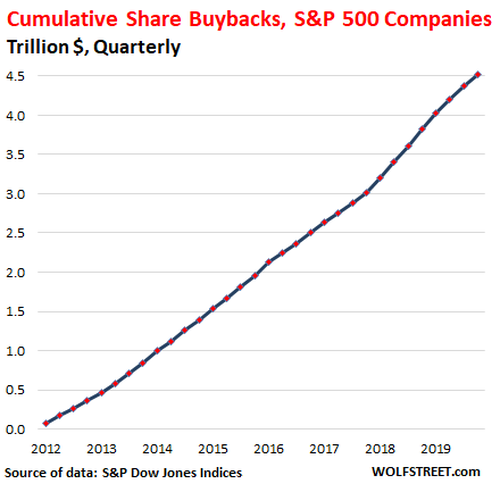 The S&P 500 companies, including those that are now asking for huge bailouts from taxpayers and from the Fed, have blown, wasted and incinerated together $4.5 trillion with a T in cash to buy back their own shares just since 2012: