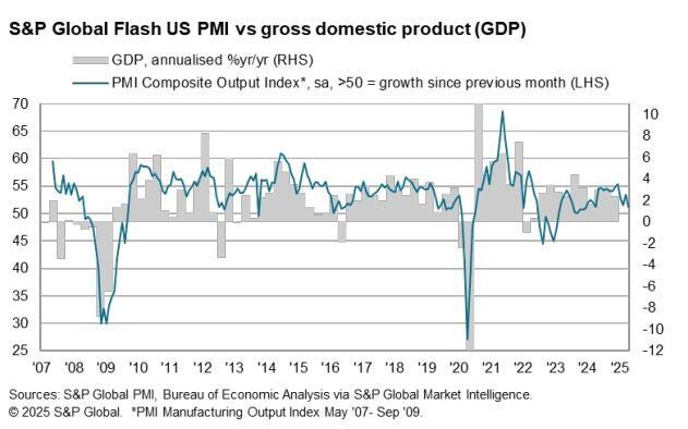 "Output rose in April at its slowest pace since December 2023, indicating that the US economy is growing at a modest annualized rate of just 1.0%. Manufacturing is broadly stagnating as any beneficial effect of tariffs are offset by heightened economic uncertainty, supply chain concerns and falling exports, while the services economy is slowing amid weakened demand growth, notably in terms of exports such as travel and tourism.