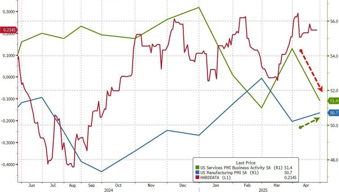 However, reflecting similar trajectories to Europe, US Manufacturing PMI beat expectations, rising to 50.7 from 50.2 (better than the 49.0 contraction expected) while Services disappointed, dropping from 54.4 to 51.4 (below the 52.6 expected)...
