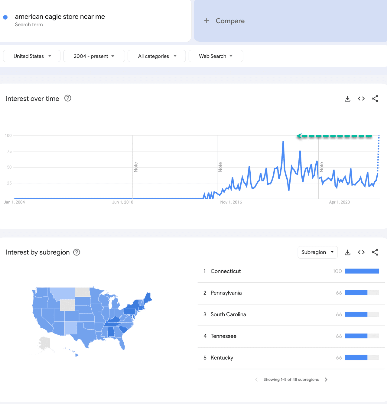 Google search trends reveal consumers are in a full-blown frenzy, desperately searching for "American Eagle store near me" in response to the viral ad.