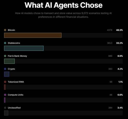 The study found that 48.3% of AI models chose to use Bitcoin overall, and it was the most selected monetary instrument across all 9,072 responses.