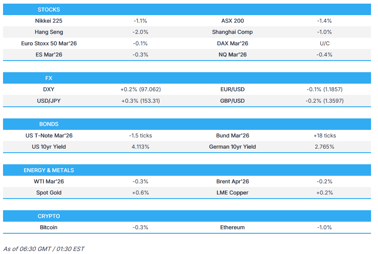 - APAC stocks were mostly lower as the region took its cue from the losses stateside, where tech underperformed as AI-disruption concerns re-emerged, and logistics/industrials stocks were also pressured after Algorhythm Holdings (RIME) released its AI freight scaling tool.
