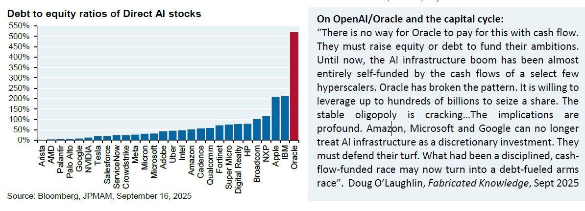 There is no way for Oracle to pay for this with cash flow. They must raise equity or debt to fund their ambitions. Until now, the AI infrastructure boom has been almost entirely self-funded by the cash flows of a select few hyperscalers. Oracle has broken the pattern. It is willing to leverage up to hundreds of billions to seize a share. The stable oligopoly is cracking…The implications are profound. Amazon, Microsoft and Google can no longer treat AI infrastructure as a discretionary investment. They must defend their turf. What had been a disciplined, cash-flow-funded race may now turn into a debt-fueled arms race.