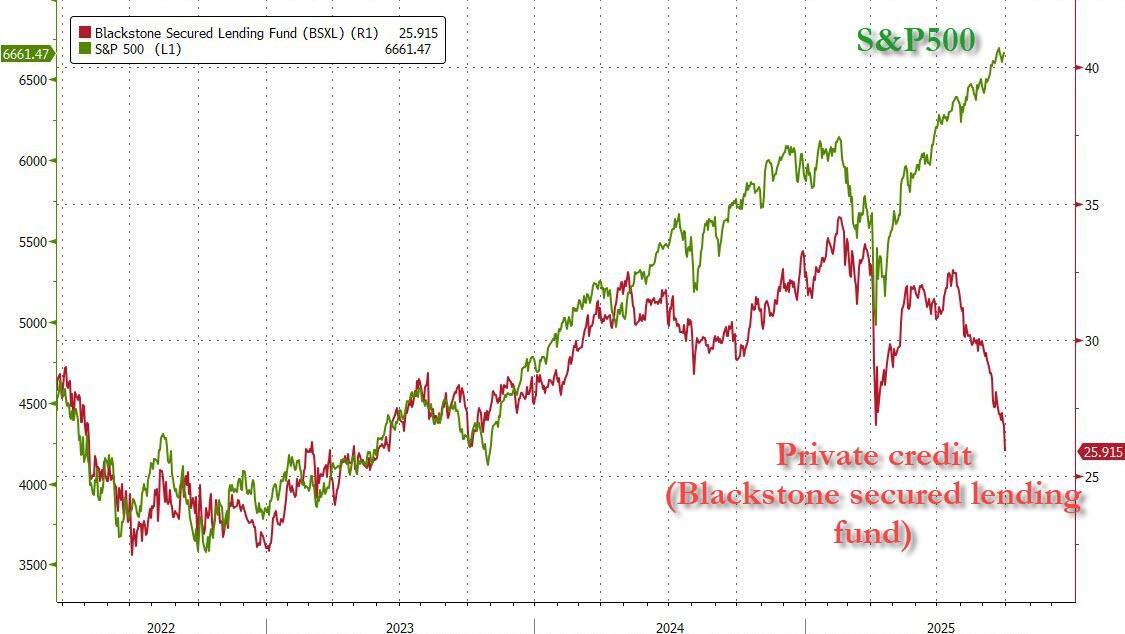 The problem, as we detailed last week, is that the private credit sector is starting to crack under the massive weight of its exposure to US consumers (where such notable implosions as the Tricolor and First Brands bankruptcies are just the beginning).