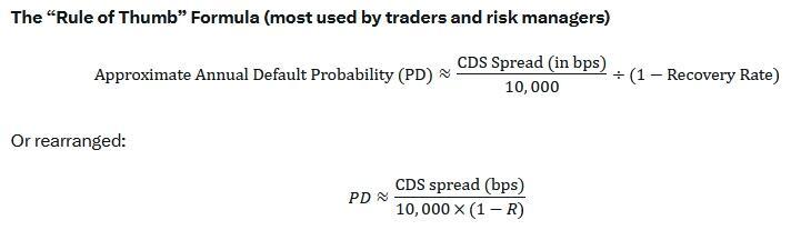 “CDS stands for credit default swaps. These are derivative contracts in which one party, the default protection buyer, pays a quarterly fee, expressed in basis points. In return, the counterparty, or protection provider, assures that in the event of default, the buyer will receive par for their bonds. CDS spreads, or the cost of default insurance, provide the market with an easy way to quantify the implied market default probability. While simplified, here is the math to calculate default risk:”