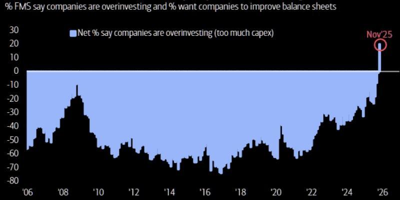 “For the first time since Aug’05, a majority (net 20%) of FMS investors say companies are overinvesting; this jump is driven by concerns over the magnitude & financing of the AI capex boom.” – BofA