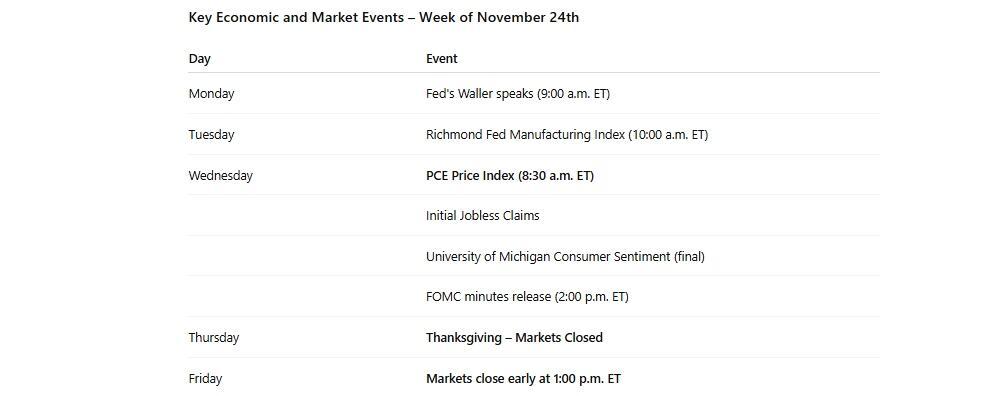 Next week is a shortened trading week due to the Thanksgiving holiday, but that doesn’t mean it will be quiet. Liquidity will be thinner, which can exacerbate volatility around key data releases. The most important report to watch is the October PCE Price Index, the Fed’s preferred measure of inflation. It will be released on Wednesday and could have a significant impact on rate expectations leading up to December’s FOMC meeting.