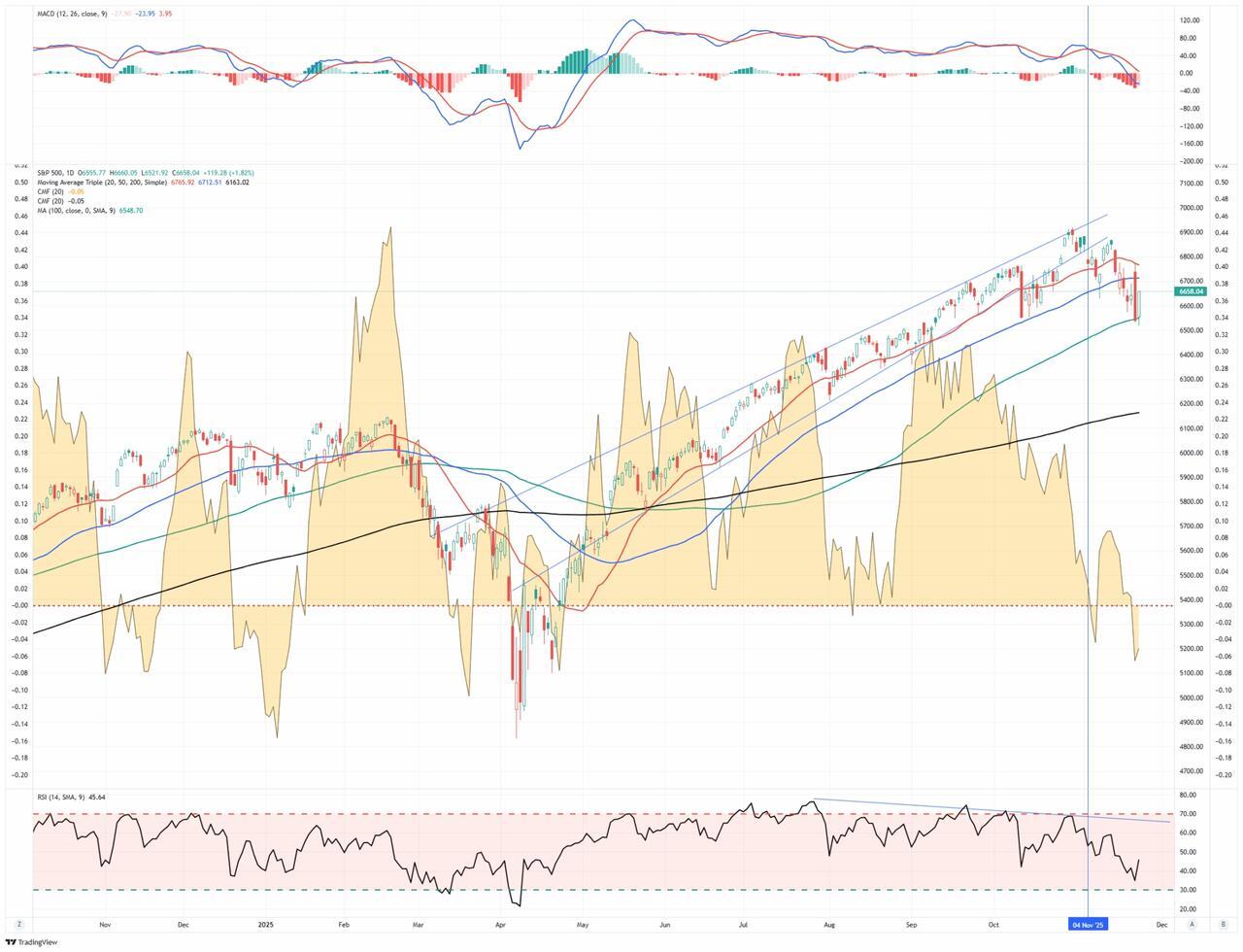 The bullish run of the past few weeks lost its footing as the S&P 500 closed back below its 50-day moving average, ending the week at 6,603. That break is notable. This level, which had previously served as reliable support since the late October low, gave way under broad selling pressure across sectors. Volume picked up on the move lower, and market breadth weakened significantly, with relative strength and breadth remaining very weak. Furthermore, money flows show the shift from accumulation to distribution.