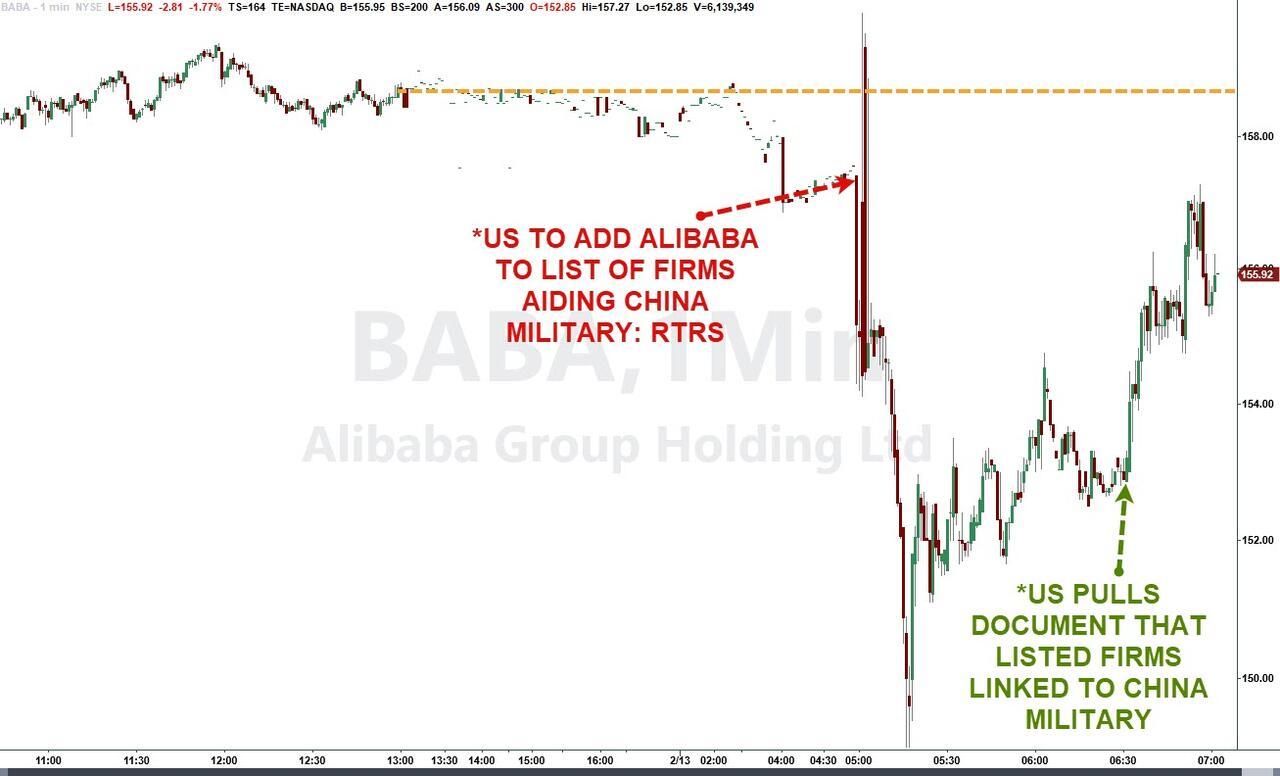 The Trump administration on Friday added some of China's biggest companies, including Alibaba and Baidu, to a list of firms allegedly aiding China's military - however, strangely the listing was pulled within mere minutes with no explanation initially issued. A Bloomberg newswire Friday morning indicated: