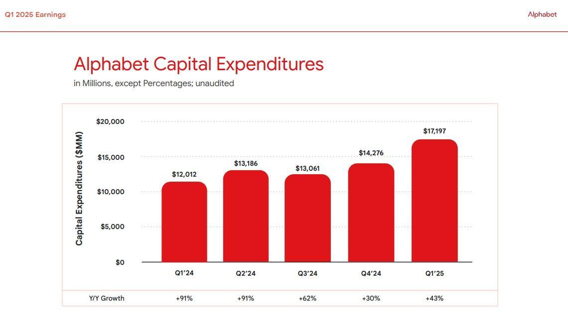 Notably, in a time when many are expecting capex to be slashed, Alphabet's capital expenditures came in hotter than expected, at $17.2BN, up 43% YoY, and just above the median estimate of $17.1BN.