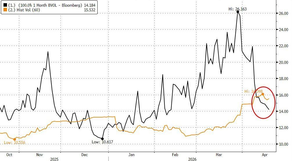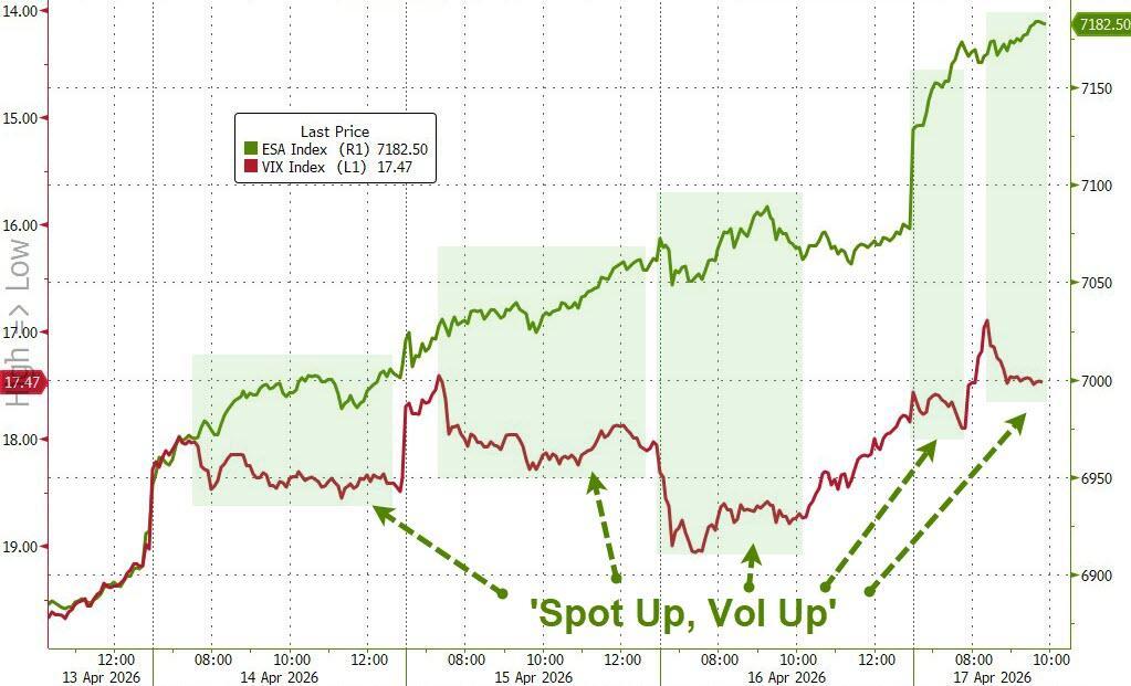 As Bloomberg's Brendan Fagan noted, the bar is no longer low: With equities at records and oil back down, the peace dividend has largely been pulled forward. If talks deliver tangible progress, either a framework or a memorandum to carve out a deal, the current rally can be validated. But if negotiations fall short, the asymmetry becomes more acute.
