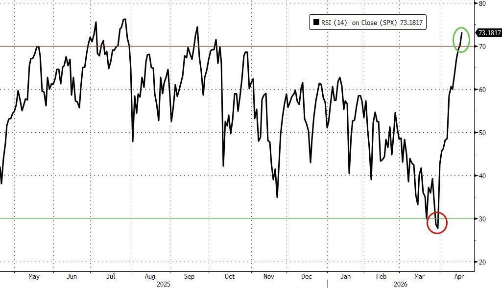 Equities went from oversold to overbought in only two weeks, a very fast reset that can often mark a real regime turn and precede a tactical consolidation that cools the momentum.