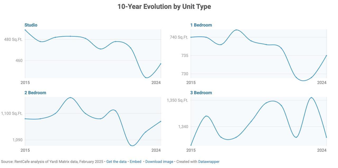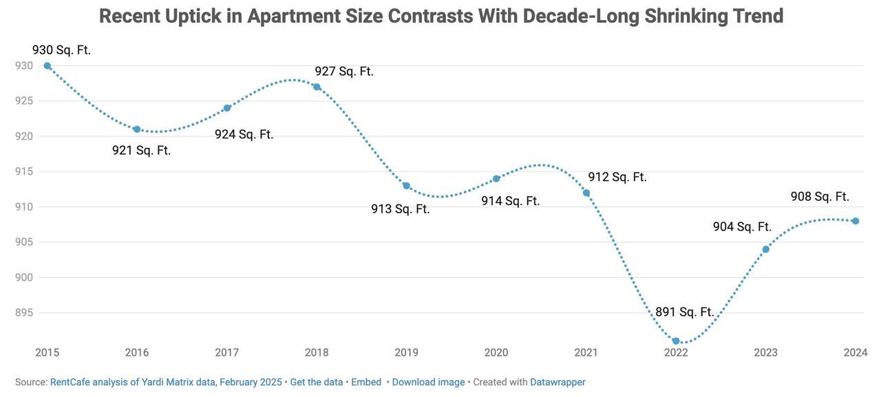 As the 2025 rental season kicks off, square footage is becoming the new currency for renters. After a decade of shrinking apartments, new data from RentCafe shows that average unit sizes grew again in 2024, reaching 908 square feet — a reversal driven largely by market demand for more livable space, according to RentCafe.