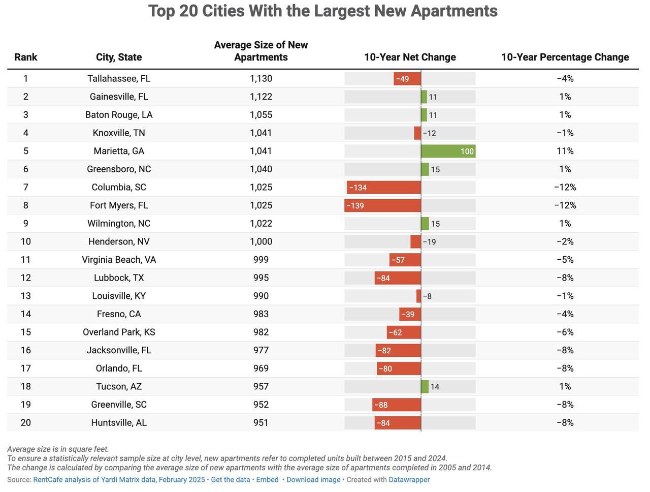 The RentCafe report says that Florida cities Tallahassee and Gainesville lead the nation for the largest new apartments, with Tallahassee units averaging 1,130 square feet despite a small decline from older stock. Baton Rouge, Knoxville, and Marietta, GA, round out the top five. In fact, Marietta posted the largest growth overall, with new apartments boasting 100 more square feet compared to those built before 2015.
