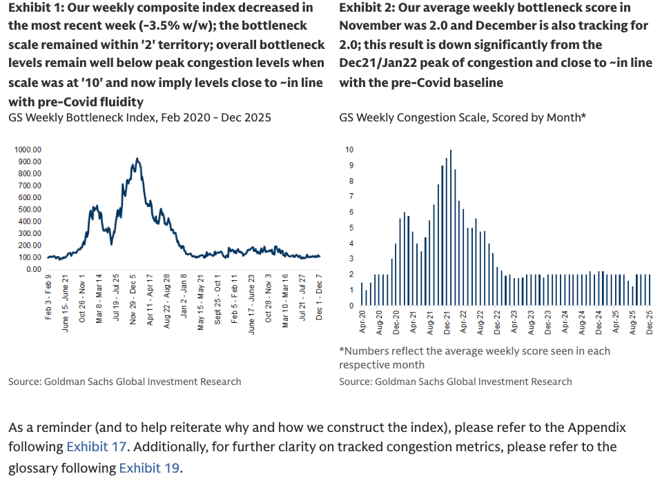 On the supply-chain front, Goldman analysts led by Jordan Alliger published the latest Supply Chain Congestion Index, showing that no bottlenecks have materialized since Trump decided on trade war 2.0 with China. The surge in congestion seen in 2021 and 2022 was driven by Covid-era disruptions, when governments shut down large parts of their economies.