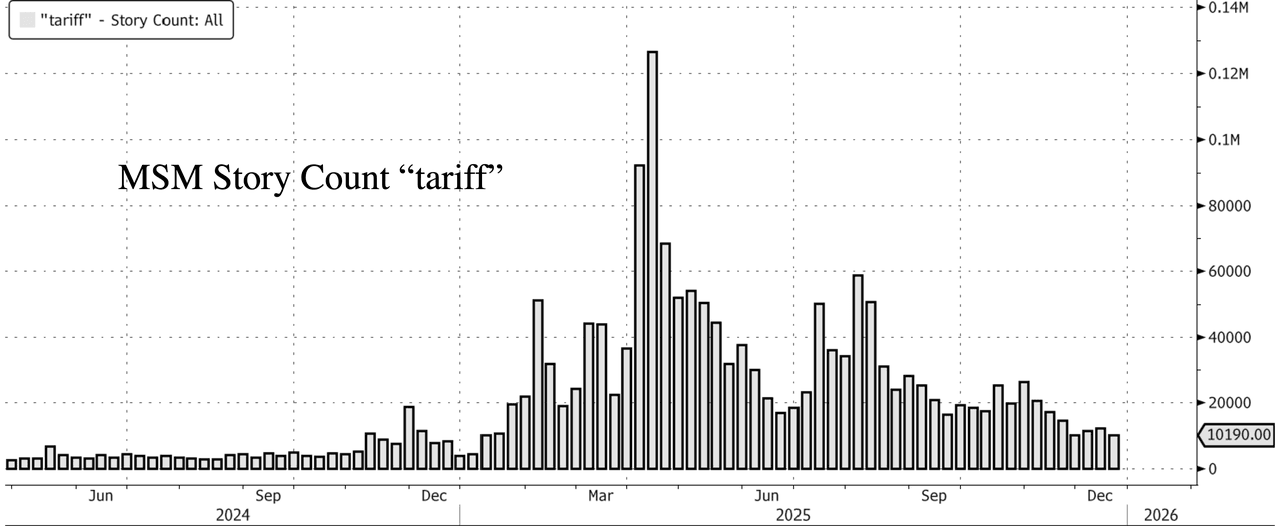 Democratic Party and MSM's supply-chain apocalypse alarm peaked in mid-April, then resurfaced in a smaller echo wave by August, according to Bloomberg data tracking mainstream media headline counts for the term "tariff."