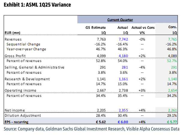 ASML's 1Q25 revenue was in-line but EBIT was above Visible Alpha Consensus Data, driven by higher gross profits which benefited from a higher share of 3800E tools in the mix (which have higher ASP) and customer specific performance target rewards. The company's bookings figure in 1Q was €3.9bn, (down qoq from a very strong 4Q24 order intake of €7.1bn and below Visible Alpha Consensus Data of c.€4.8bn), including €1.2bn of EUV orders (below cons estimate of €1.6bn). As such, we note that the 1Q25 order intake of €3.9bn is higher than the order run-rate needed (c.€3-4bn) to hit the 2026 cons estimate. Importantly the company shipped another High NA tool in the quarter which could be taken positively by investors. The company acknowledged macro uncertainty but sees AI as the main driver of its market. Furthermore, the company stated that based on its discussions with customers it sees both 2025 and 2026 to be growth years. The company introduced its 2Q25 net sales guidance of around €7.2-7.7bn and expects 2Q25 gross margins to be around 50-53% (a wider range to reflect macro uncertainty) implying revenue/gross profit/EBIT that is 4%/6%/10% below cons. Further, ASML reiterated its 2025 guidance and expects sales of €30-35bn, with gross margins of 51-53%. Additionally, we note that ASML's 2Q25 guide for GM includes a certain degree of dilution from ramp of high NA but the company remains on track to deliver its FY25 GM target as it expects 3800E to become the main Low NA tool being shipped to customers.