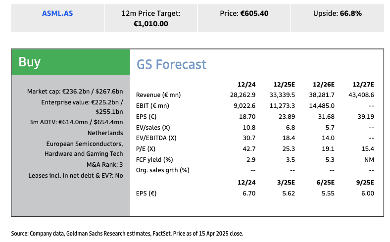 We are Buy rated on ASML with a 12-month price target of €1,010 based on a 32x CY26E P/E multiple. Key risks to our view and price target include EUV delays, capex cyclicality and unfavourable market share shifts.