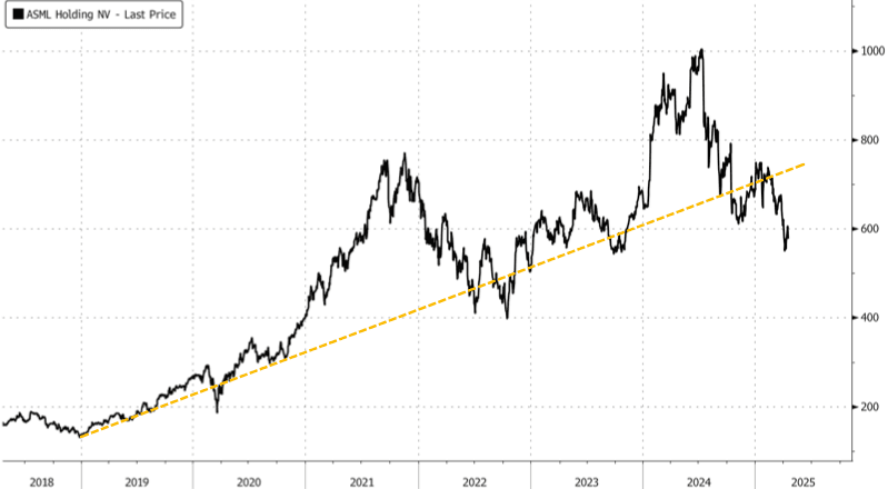 ASML's shares fell 5% to 575 euros in the early afternoon trading hours in Europe. Shares are down 42% since peaking at around 1,000 euros in mid-July last year.