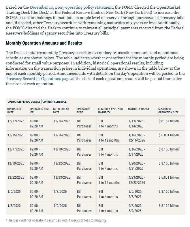 As shown in the schedule below and as was first announced yesterday, the Fed plans to buy $40 billion of T-bills, spanning two sectors, over the period beginning Dec. 12 and ending Jan. 14 for "reserve management purchases." This includes $8.2 billion on Friday (full schedule here).