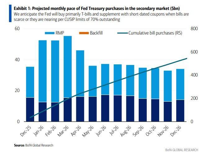 Earlier in the day, Barclays published a note estimating that the Fed could wind up buying close to $525 billion of T-bills in 2026 from a previous forecast of $345 billion, with net issuance to private investors estimated at just $220 billion from $400 billion previously.