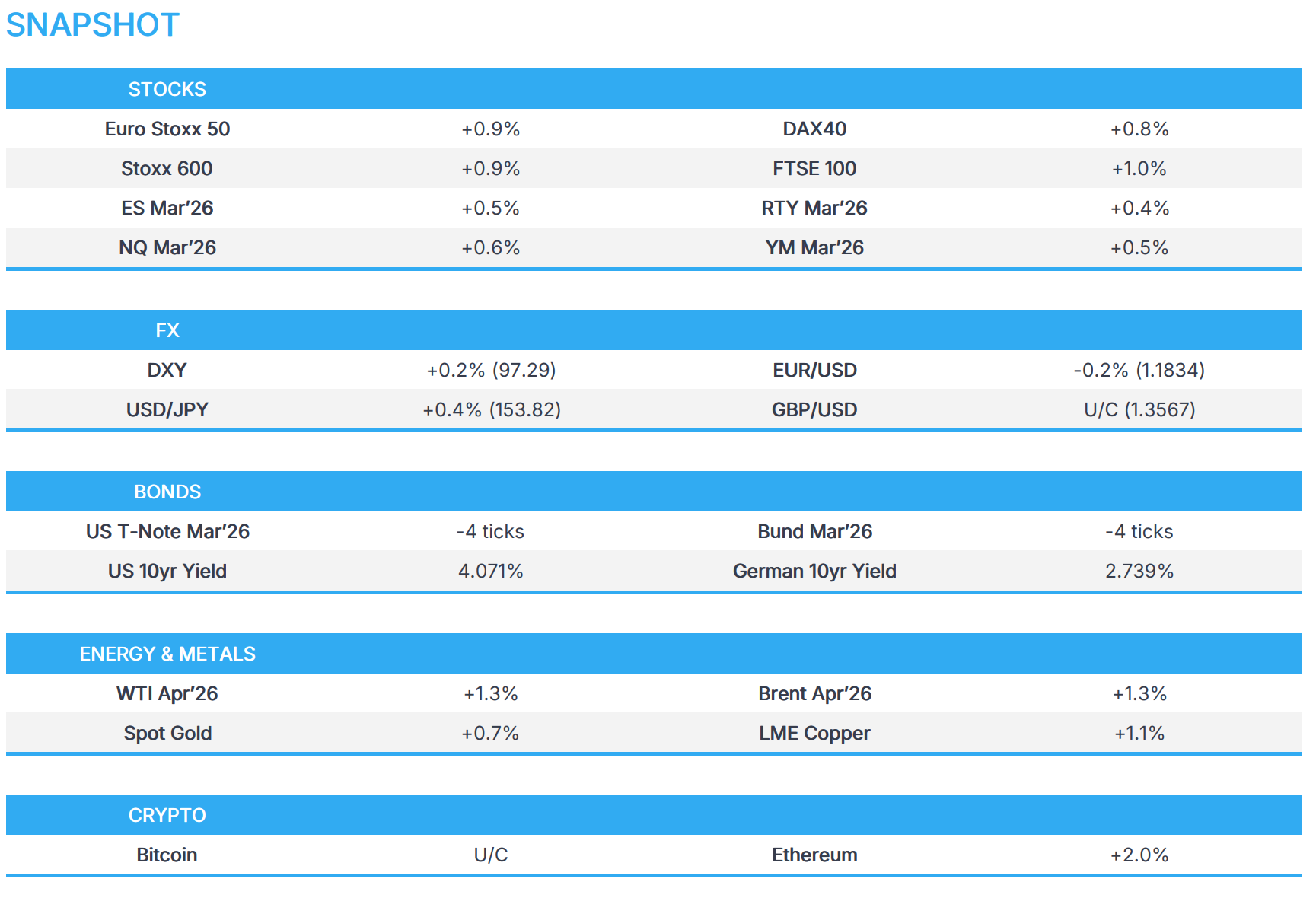 - European bourses (STOXX 600 +0.7%) are trading entirely in the green, with the IBEX (+1.1%) leading gains, closely followed by the FTSE MIB (+0.9%) and the FTSE 100 (+0.7%).