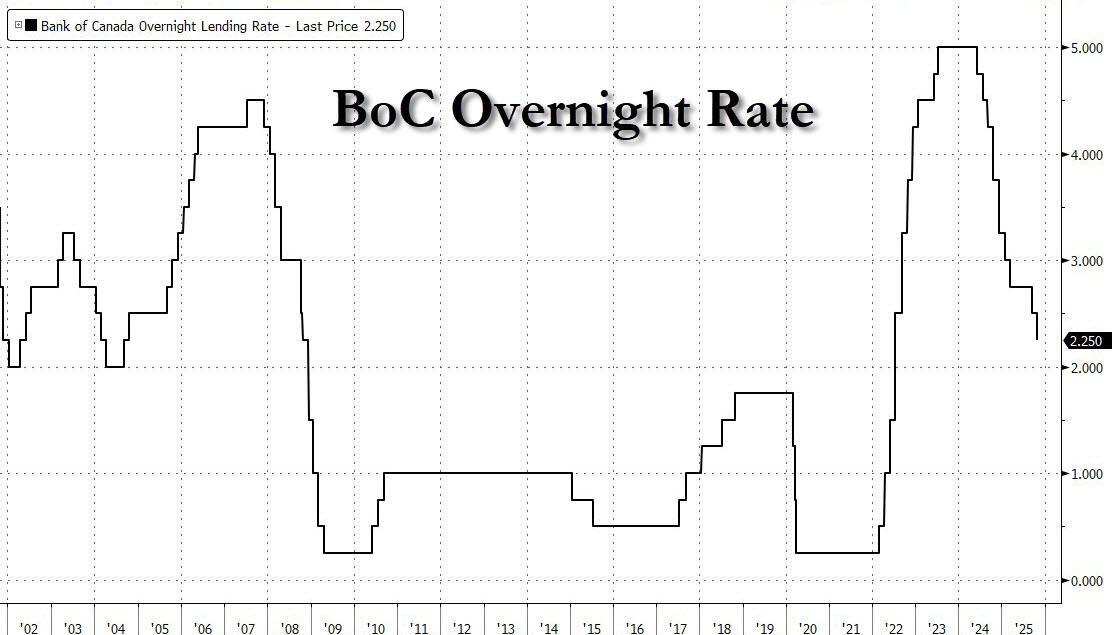 In a preview of what is to come today at 2pm from the Fed, moments ago the Bank of Canada cut rates by 25bp to 2.25%, as expected, noting that current policy is "about the right level" to keep inflation close to 2% while helping the economy through this period of structural adjustment.