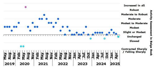 Fast forward to today when the latest, May, Beige Book was released, and it revealed that according to reports across the 12 Fed district, "economic activity has declined slightly since the previous report" with half of the districts reporting slight to moderate declines in activity, three Districts reported no change, and three Districts reported slight growth.