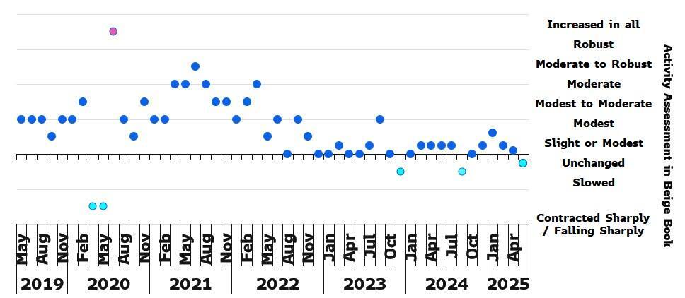 - Cleveland: District business activity continued to be flat in recent weeks, and contacts expected activity to remain flat in the months ahead. Retailers noted a pullback in consumer spending, and manufacturers reported softer orders. Many contacts attributed robust cost increases to tariffs and said that their selling prices increased moderately.
