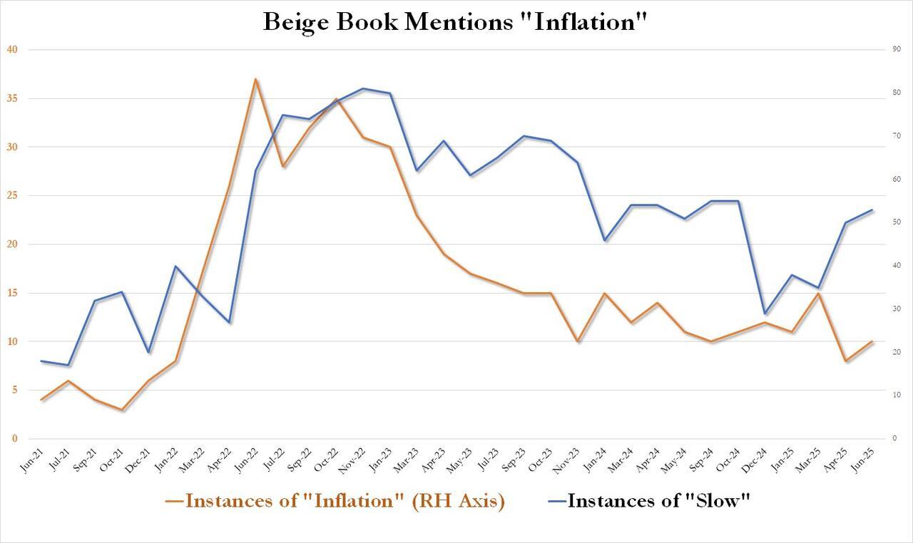 Many were stunned after the latest inflation and core PCE data confirmed that the experts were once again dead wrong, and instead of the widely expected inflation tsunami, Trump's tariffs have so far sparked only continued disinflation (which will only become more acute as home prices slide). And yet, anyone who read our Beige Book analysis from last month (not to mention our prediction from last June that "The Experts Are All Wrong About Inflation Under A Trump Presidency") would have known just that: as we laid out, "Beige Book Finds Inflation Mentions Tumble To 3 Year Low" which was the clearest indication that despite the prevailing narrative, rising prices is simply not a thing businesses across the US are worried about.