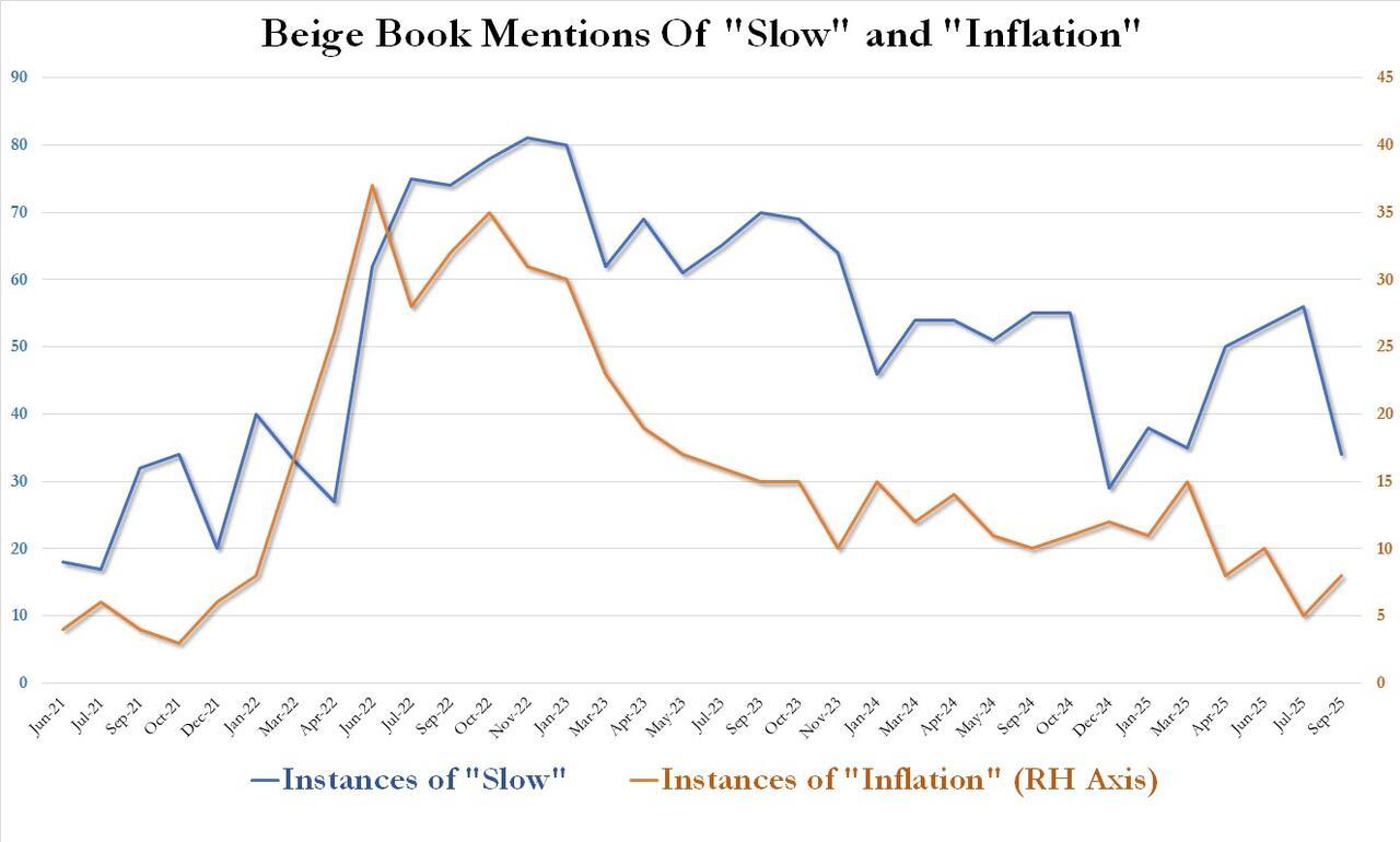 Many were shocked (again) after the latest CPI and PPI data confirmed that the experts were once again dead wrong, and instead of the widely expected inflation tsunami, Trump's tariffs have so far sparked only sporadic disinflation, which will only become more acute as the home prices slide accelerates. And yet, anyone who read our Beige Book analysis from April (not to mention our accurate prediction from last June that "The Experts Are All Wrong About Inflation Under A Trump Presidency") would have known just that: as we laid out, "Beige Book Finds Inflation Mentions Tumble To 3 Year Low" which was the clearest indication that despite the prevailing narrative, rising prices is simply not a thing businesses across the US are worried about. We got further confirmation of this last month, when the latest Beige Book found no runaway inflation (again) but instead that sentiment in the economy splitting along party lines.