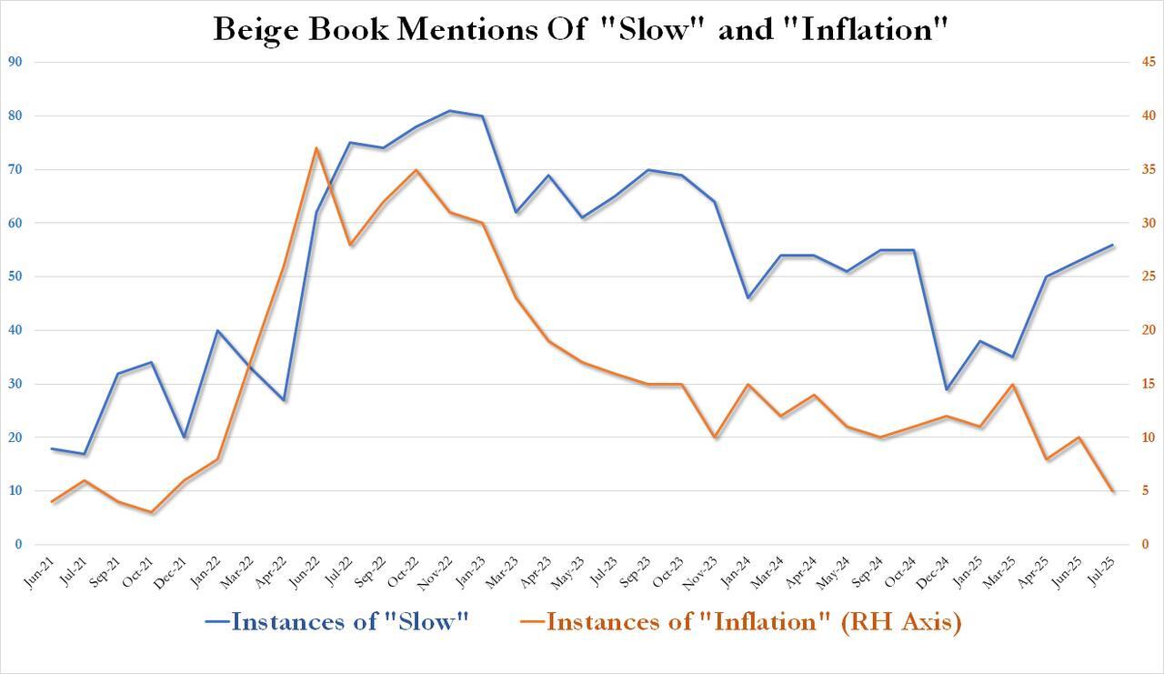 And finally, confirming that contrary to conventional wisdom the economic picture has been largely unchanged since April, the latest Beige Book found that contrary to prevailing media narratives, mentions of inflation actually dropped again, sliding to a new four year low of just 5 from 10 the previous month (effectively before the Biden inflationary explosion period) while mentions of "slow" rose to the highest since last October, just after the Powell Fed cut rates by 50bps. Overall, a very awkward report for a Fed that no longer has any excuse not to cut.