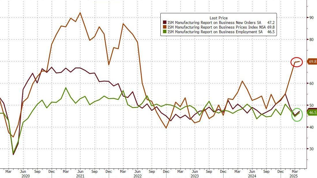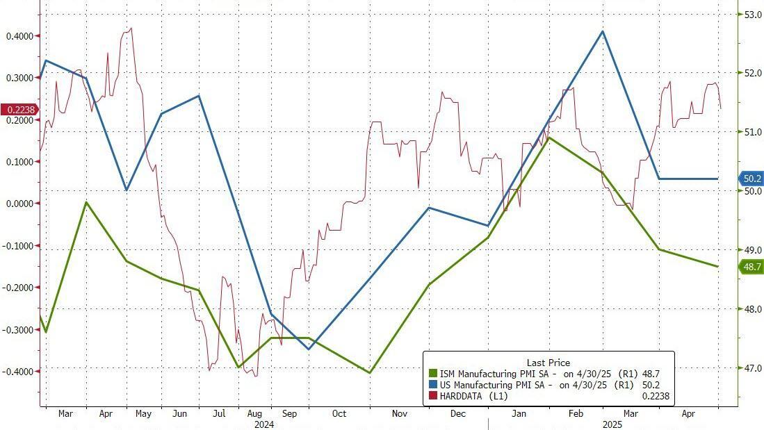 ISM's Manufacturing PMI beat expectations, printing 48.7 (down from the 49.0 in March but better than the 47.9 expectations) - lowest since Nov 2024.