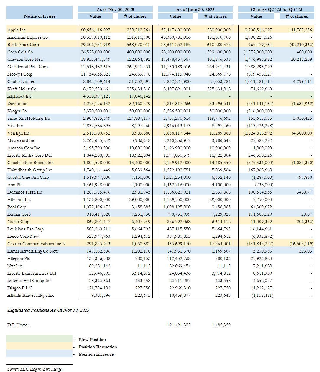 - Added 400K shares of Coke, bringing the total value to $26.5 billion.