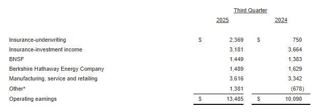 At the same time operating earnings jumped 34% to $13.5 billion from $10.1 billion, as the firm’s insurance underwriting profit more than tripled in the third quarter boosted by lower insurance losses, offsetting declines in the Insurance-investment income and Berkshire's Energy company.