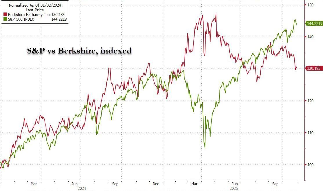 And indeed, it's not just Berkshire that has not been buying back its own stock: investors have voted their apprehension about Berkshire's outlook and pending management change by selling its stock. Since Buffett announced on May 3 he would step down, Berkshire's stock price has fallen 12%, and trailed the S&P by 32%. For all of 2025, Berkshire is 11% points behind the index.
