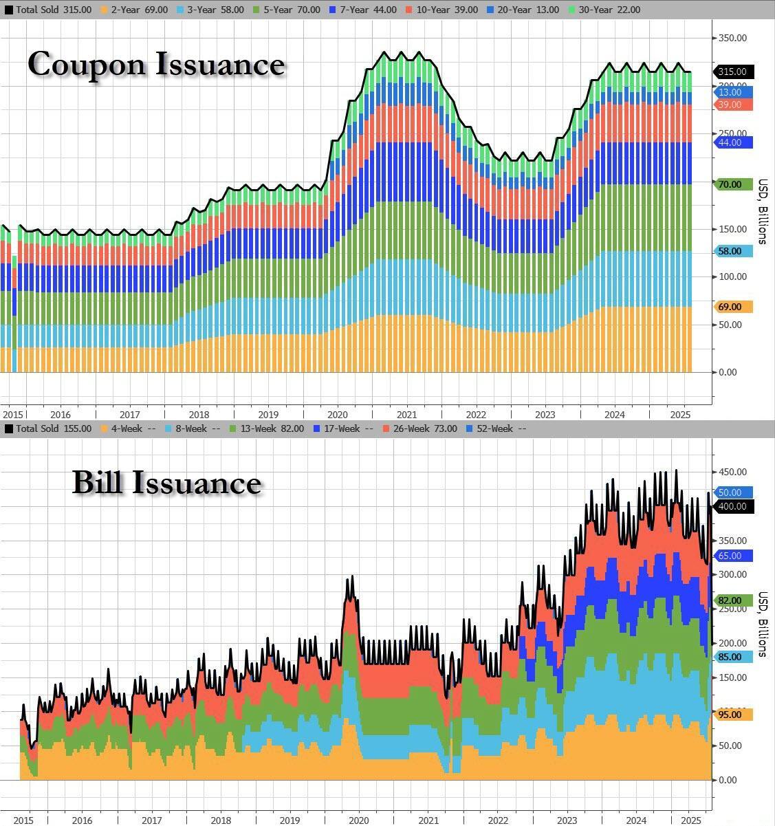 In today's closely watched Quarterly Refunding Announcement on debt issuance - which to many was more important than the FOMC statement - the Treasury Department said at 8:30am ET that that it anticipates keeping the size of its note and bond auctions unchanged “for at least the next several quarters." And since that was the same guidance the Treasury has given since the start of last year, it leaves bills, which were the fulcrum security of Janet Yellen's Activist Treasury Issuance strategy so repeatedly penned by Scott Bessent, once again bearing the brunt of the government’s rising borrowing needs, although as the charts of Bill and Coupon issuance below show, the US is already pretty much at 10.... so these better go to 11.
