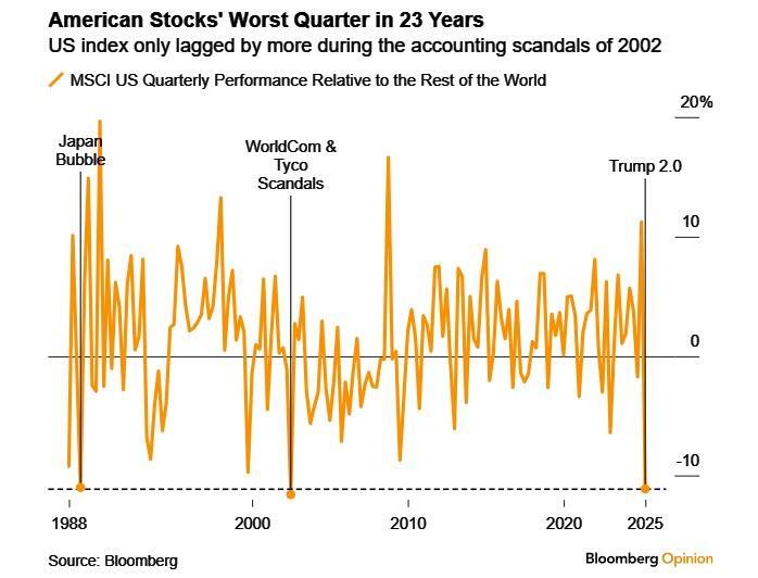 But it wasn’t all bad news, and European equities saw a significant outperformance thanks to a huge fiscal regime shift towards higher defense spending. In fact, Q1 marked the biggest quarterly performance gap between the STOXX 600 and the S&P 500 in a decade, and the biggest underperformance of the US vs the rest of the world in 23 years.