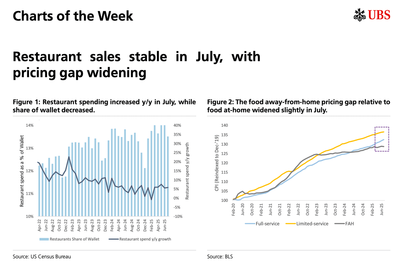 In a note to clients, UBS analyst Dennis Geiger highlighted the widening gap between food away from home and food at home; in other words, eating at home is getting much cheaper.