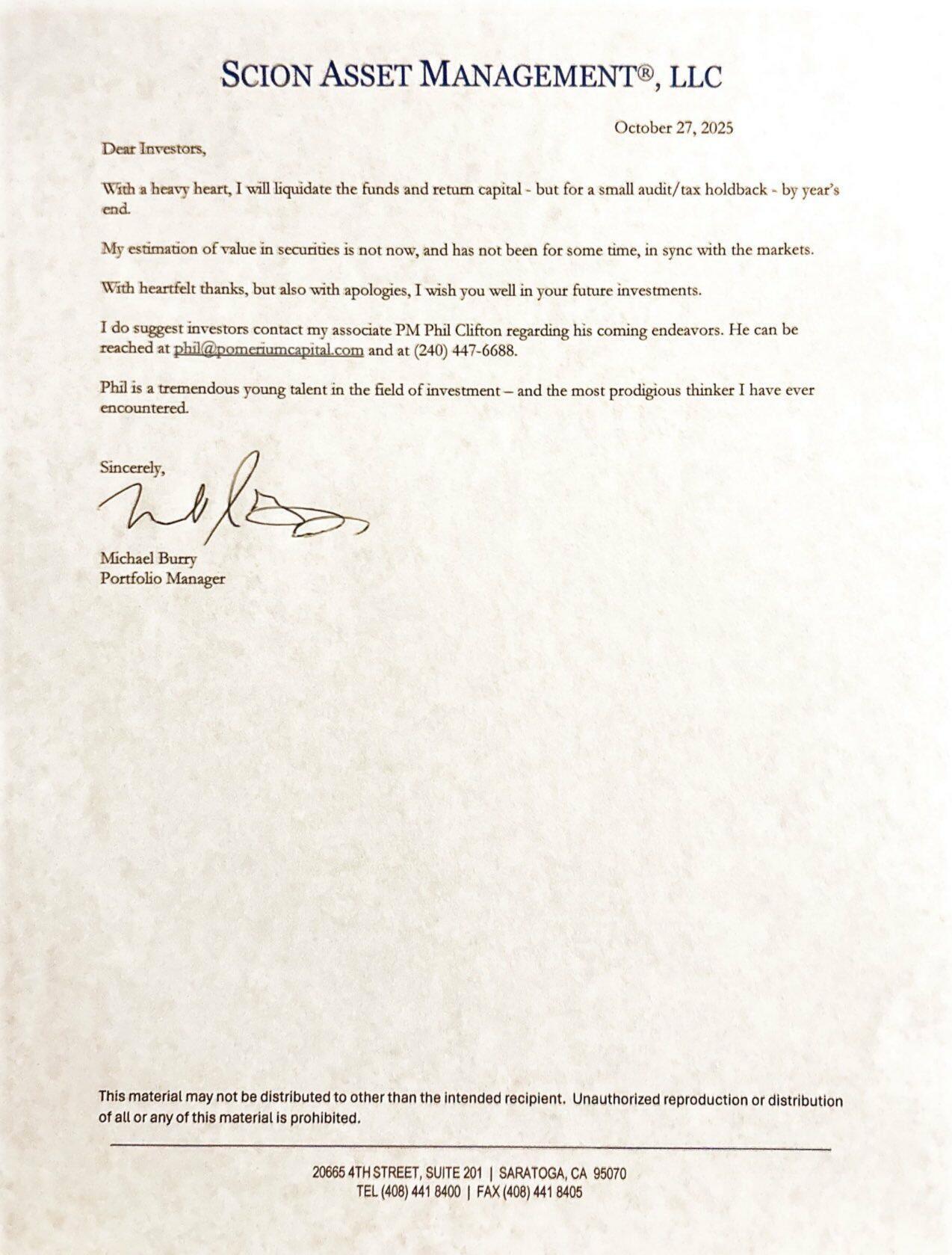 Burry sent a letter to investors late last month, noting: "With a heavy heart, I will liquidate the funds and return capital — but for a small audit/tax holdback — by year's end."