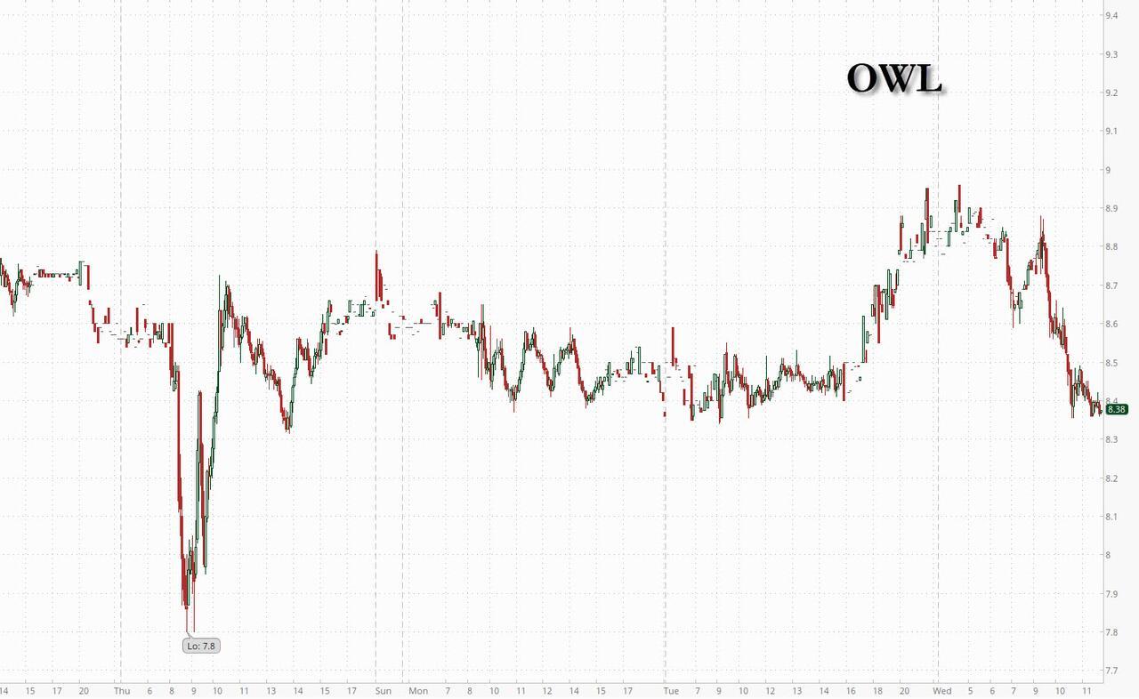 As we have repeatedly discussed, Blue Owl has become the poster child for private credit funds that are struggling with an elevated level of redemptions. Its stock has more than halved over the past 12 months and is trading near record low, and on Wednesday it reversed all early gains and was trading down 1%, if still above its record lows hit last week.